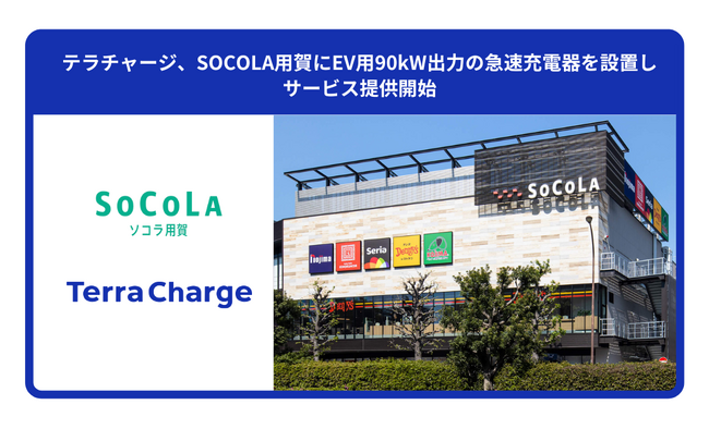 電気自動車(EV)向け充電サービス「Terra Charge(テラチャージ)」を展開するTerra Charge株式会社(本社:東京都港区、代表取締役社長:徳重徹、以下、当社)は、地域密着型商業施設「SOCOLA(ソコラ)用賀」に、最大出力90kWの急速EV充電器2口タイプ1基を設置し、サービス提供を開始いたしました。