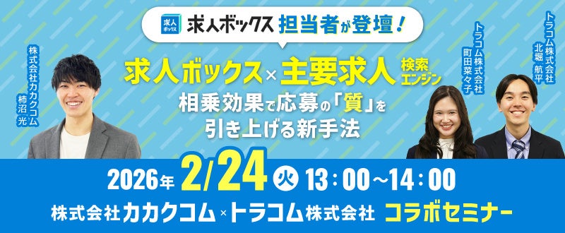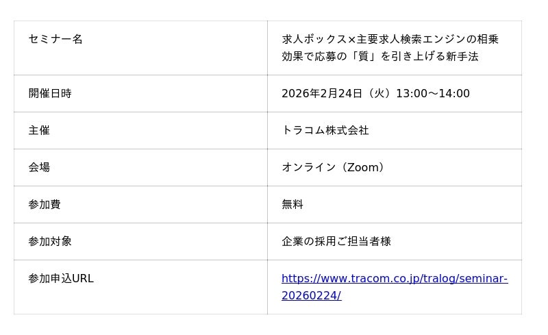 - 【2月24日(火)】求人ボックス×主要求人検索エンジンの採用戦略セミナーをオンライン開催|トラコム株式会社02/13 13:34