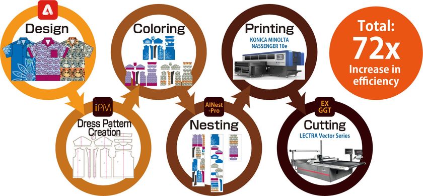 Beyond Visionを使ったカスタムアパレルの生産フローはデザイン、型紙作成、製造データ生成などの主要工程をAdobe Illustrator(注1)に統一しデータ連携をシームレスにします。工程の簡略化に加え生産性の面でも従来と比較し72倍の向上(注2)を実現し、大幅なコスト削減を可能にするものです。