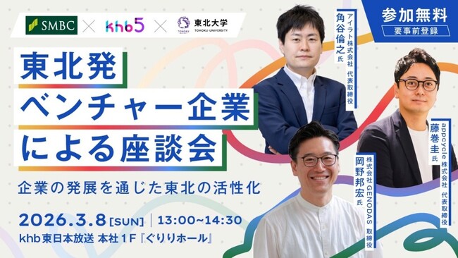 株式会社東日本放送(本社:仙台市太白区)は、2026年3月8日(日)に株式会社三井住友銀行(以下、三井住友銀行)、国立大学法人東北大学(以下、東北大学)とともに、「東北発ベンチャー企業による座談会~企業の発展を通じた東北の活性化~」を開催いたします。