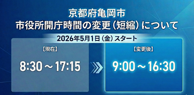 京都府亀岡市(市長:桂川 孝裕)は、2026年5月1日(金)より、市役所本庁舎等の開庁時間を現在の「午前8時30分~午後5時15分」から「午前9時~午後4時30分」に変更いたします。