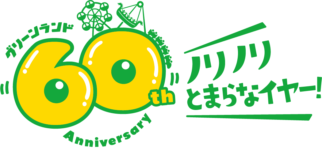 60周年記念ロゴは「60」と「Anniversary」の文字が笑顔を形作るビジュアルに仕上がっており、開園当時は観光果樹園としてオープンしたグリーンランドを象徴する、実りある光沢感を演出しております。