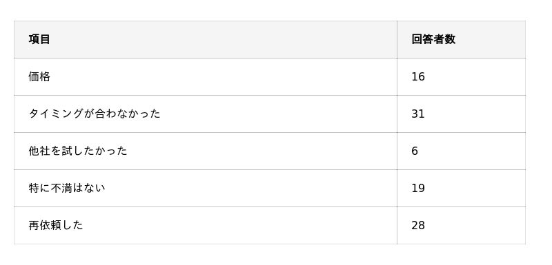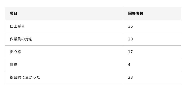 - 再依頼の一番の決め手になったのが「仕上がり」「作業員の対応」「総合的に良かった」といった点。