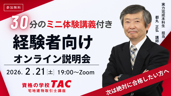 宅建士試験対策講座を展開しているTAC株式会社(東京都千代田区、代表取締役:多田敏男)は、2/21(土)19:00より宅建試験の受験・学習経験者向けの無料オンラインセミナーを開催します。