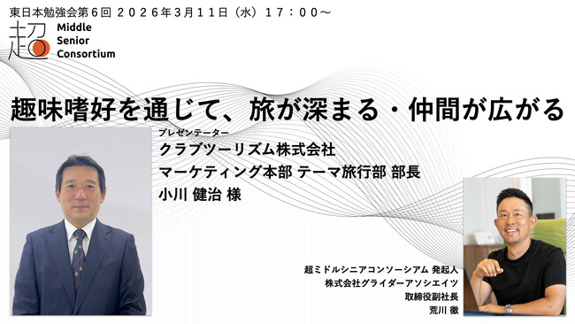 2025年6月6日に発足した、企業の枠組みを超えた共創を目指す共同体「超ミドルシニアコンソーシアム」。6回目となる勉強会を、プレゼンテーターにクラブツーリズム株式会社様をお迎えし、2026年3月11日(水)に開催いたします。