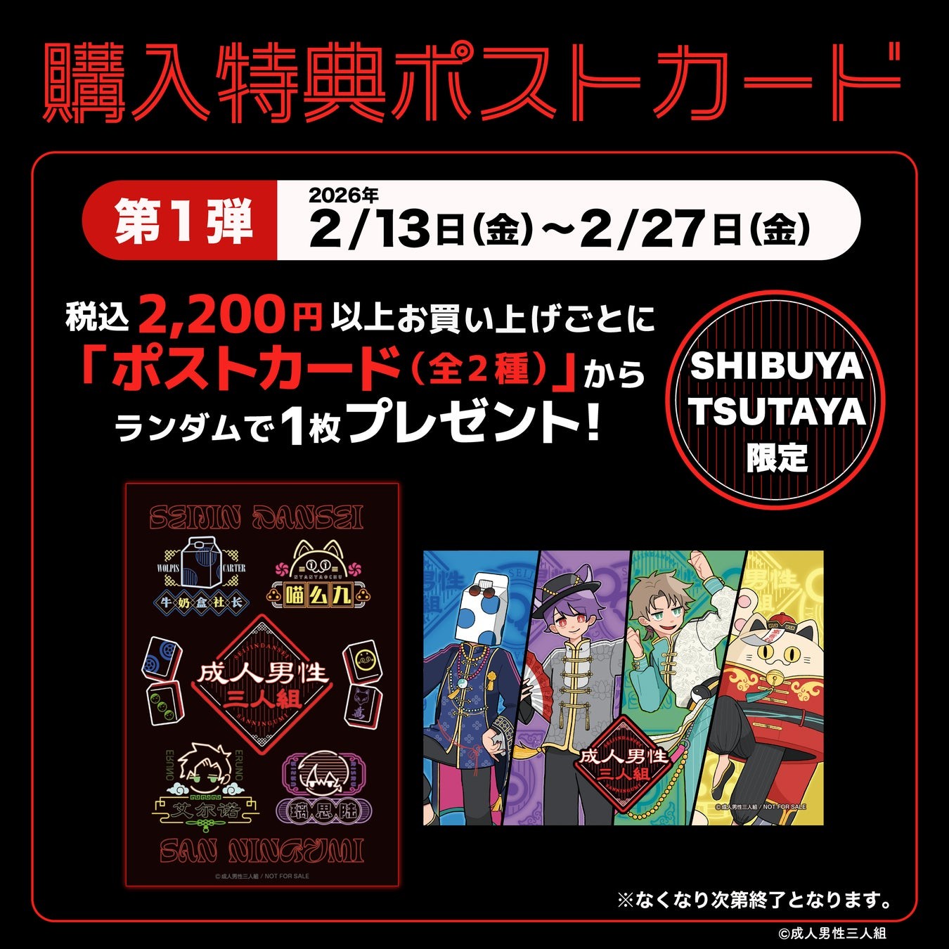 2026年2月13日(金)より、歌い手グループ『成人男性三人組』POP UP SHOPがSHIBUYA TSUTAYA 6階 IP書店で開催決定!!