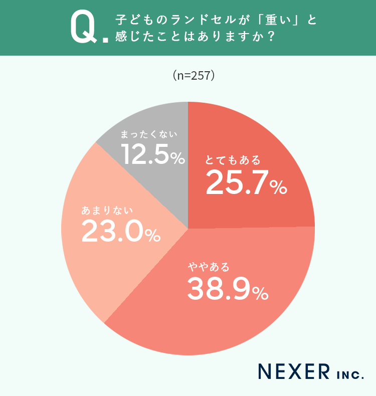 その結果「ややある」が38.9%で最も多く、次いで「とてもある」が25.7%となりました。両方を合わせると64.6%の保護者がランドセルの重さを実感していることがわかります。