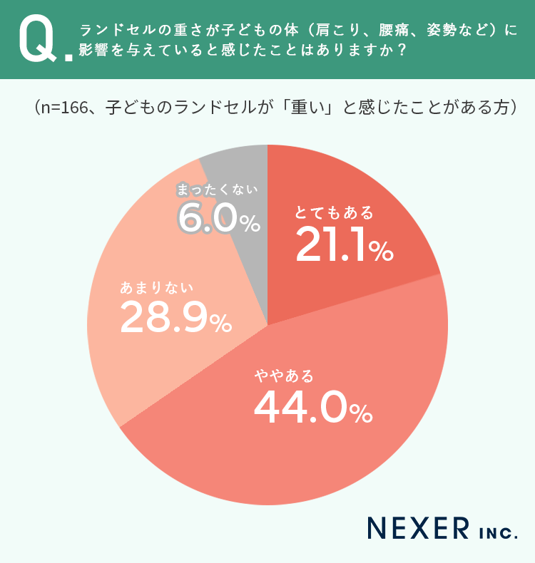 その結果「ややある」が44.0%で最も多く、「とてもある」の21.1%と合わせると、65.1%の保護者がランドセルの重さによる体への影響を感じていることがわかりました。「あまりない」は28.9%、「まったくない」は6.0%にとどまっています。