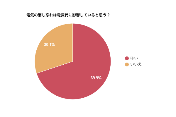 電気の消し忘れが電気代に影響しているかを聞いたところ、「はい」と回答した方は69.9%にのぼりました。一方で、「いいえ」と回答した方は30.1%にとどまっています。この結果から、約70%の方が消し忘れが電気代に影響していると感じていることが分かります。