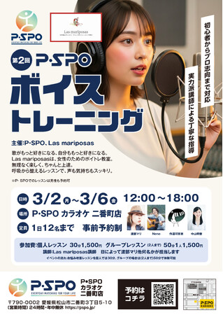 愛媛県内で女性向けボイストレーニング教室を展開。昨年開催のP・SPOカラオケコンテストにも講師協力。[画像6: https://prcdn.freetls.fastly.net/release_image/4256/359/4256-359-a1107001f3a21bc6aeffa8e089c3e6ff-560x315.jpg?width=536&quality=85%2C75&format=jpeg&auto=webp&fit=bounds&bg-color=fff ]