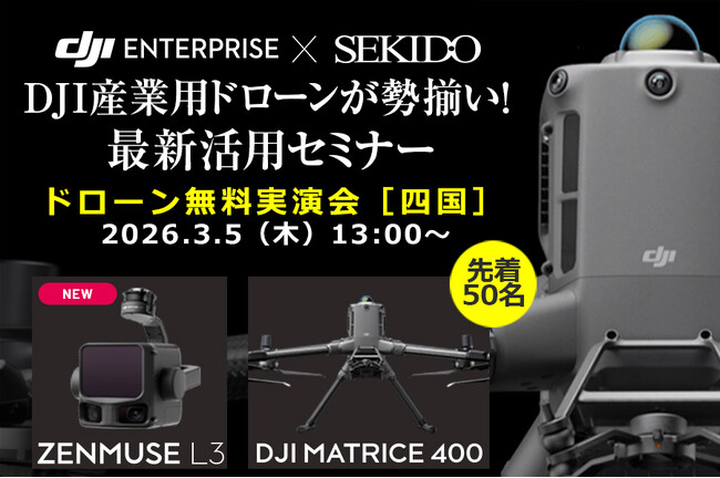 DJI(ディージェイアイ)正規販売代理店としてドローンビジネスの最前線を支える株式会社セキド(本社:東京都港区、代表取締役:大下貴之)は、株式会社矢野商店(本社:徳島県徳島市、代表取締役社長:矢野真二)と共催で、2026年3月5日(木)に徳島県美馬市にて「【課題へご提案】DJI業務用ドローン勢揃い!最新活用セミナー」を開催します。