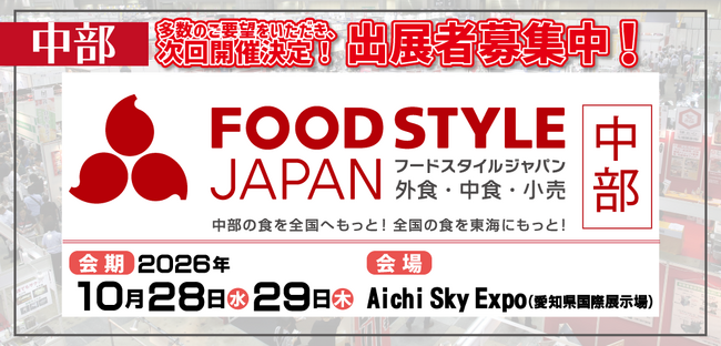 FOOD STYLE Chubu 実行委員会(株式会社イノベント内)は、2026年10月28日(水)~29日(木)の2日間、Aichi Sky Expo(愛知県国際展示場)にて、中部地域最大級の食の商談展示会「FOOD STYLE JAPAN 2026 <中部>」を開催いたします。