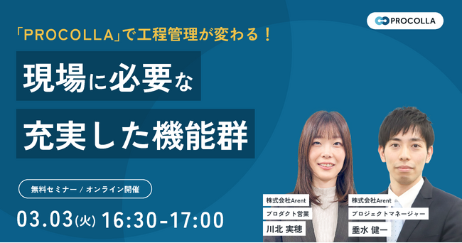 株式会社Arentは、2026年3月3日(火)に、「プロコラで工程管理が変わる~現場に必要な充実した機能群~」をテーマに、大林組と共同開発したAIクラウド工程管理システム「PROCOLLA(プロコラ)」の解説セミナーをオンラインにて開催します。