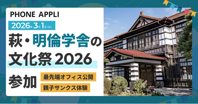 すべての企業をウェルビーイング企業にアップグレードすることを目指す、株式会社PHONE APPLI(本社:東京都港区、代表取締役社長:大林 春彦)は、2026年3月1日(日)に萩・明倫学舎(山口県萩市)で開催される「萩・明倫学舎の文化祭2026」(主催:NPO萩明倫学舎)に参加し、4号館入居事業者として当社の萩 明倫館オフィス(CaMP HAGI)の公開を含めた体験イベントを開催いたします。