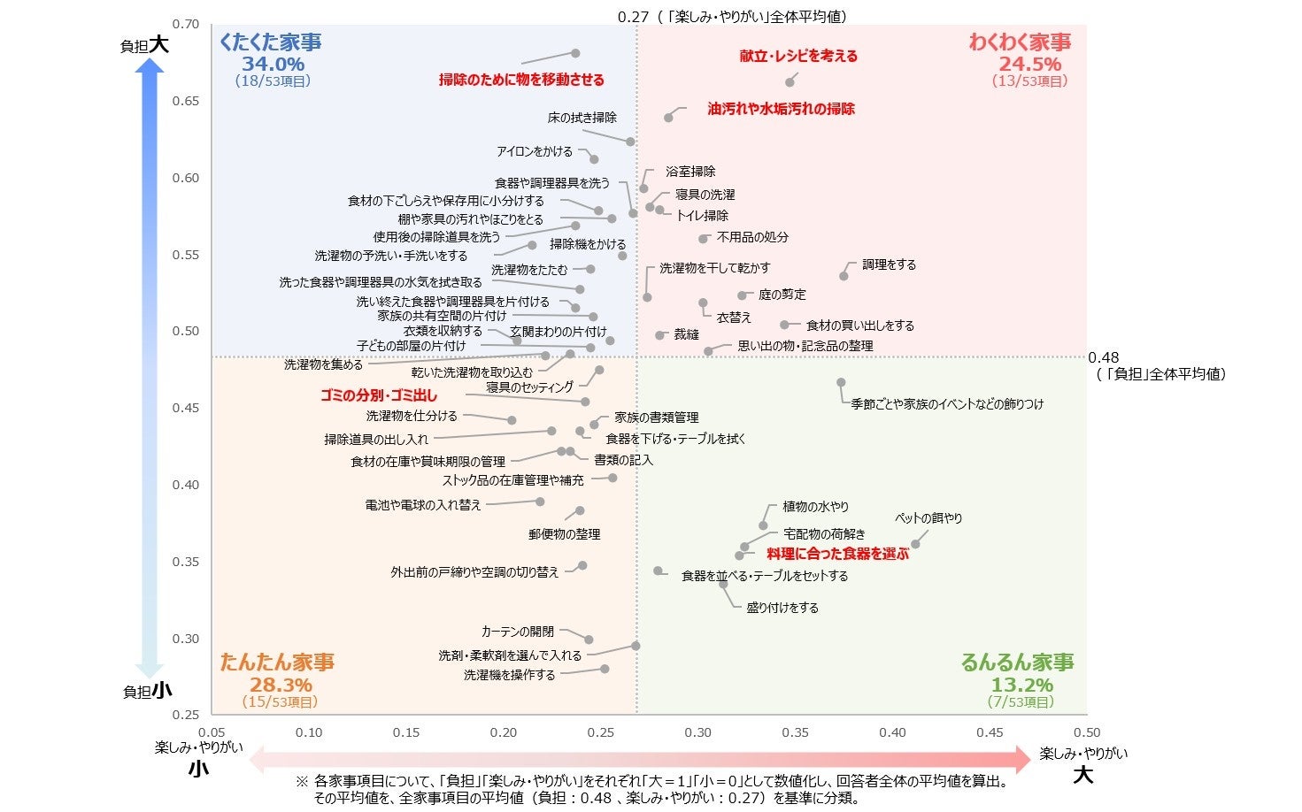 今回の調査では、全国の既婚男女1,101名を対象に、三大家事(「炊事」「洗濯」「掃除」)を、家庭全体の家事量において3割以上実施している人から回答を得て集計。「負担」と「楽しみ・やりがい」の大きさの観点から定義した4つの分類「くたくた家事」「わくわく家事」「たんたん家事」「るんるん家事」をあらかじめ設定し、家事53項目それぞれがどの分類に最も近いかを選択してもらいました。