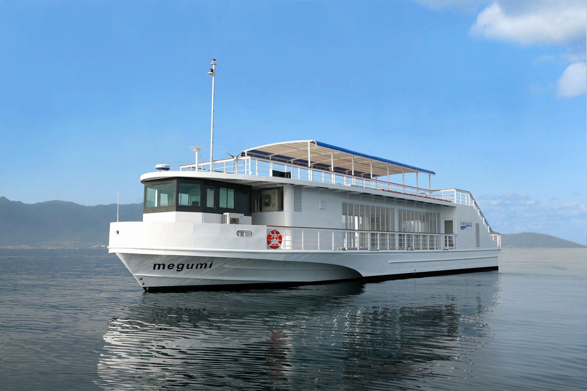 就航船megumiはサイド全面に大きな窓があり、柱のない大きな船室内にて快適にお過ごしいただけます。デッキは1階と2階にあり、360度のパノラマで、びわ湖の絶景や史跡など、各所の見どころをご覧いただけます。カルチャー講師として、滋賀県立安土城考古博物館の元副館長・大沼芳幸先生が、船内モニターを活用し、わかりやすく解説します。