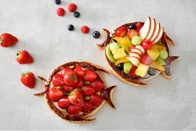 リンゴ、キウイ、オレンジ、メロン、イチゴなど、色とりどりのフルーツを贅沢に飾った新作です。リンゴの飾り切りで魚らしさあふれるデザインに仕上げました。やさしい甘さのカスタードクリームとパイ生地との相性も抜群の美味しさです。