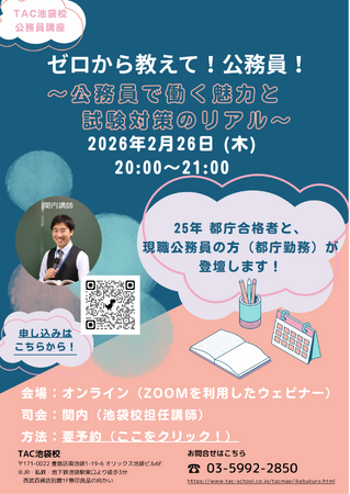 - 【TAC公務員】ナイトガイダンス「ゼロから教えて!公務員!~公務員で働く魅力と試験対策のリアル~」を2/26(木)にオンラインで開催02/16 17:10
