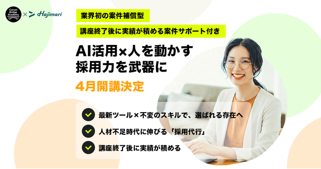 株式会社Hajimari(本社:東京都渋谷区、代表取締役:木村直人)は、人事専門コンサルタントを育成するキャリアブリッジアカデミー(以下:CBA)と共同で、案件紹介確約型の新講座「採用代行講座 ~ 生成AI × 採用マーケティング~ by CBA」を開講したことをお知らせいたします。
