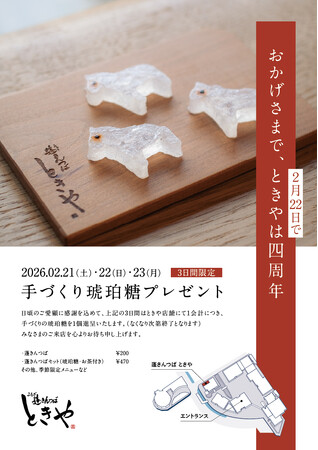 日頃のご愛顧に感謝を込めて、2026年2月21日(土)から2月23日(月・祝日)の3日間はときや店舗にて1会計につき手づくりの琥珀糖を1個進呈いたします。(なくなり次第終了となります。)
