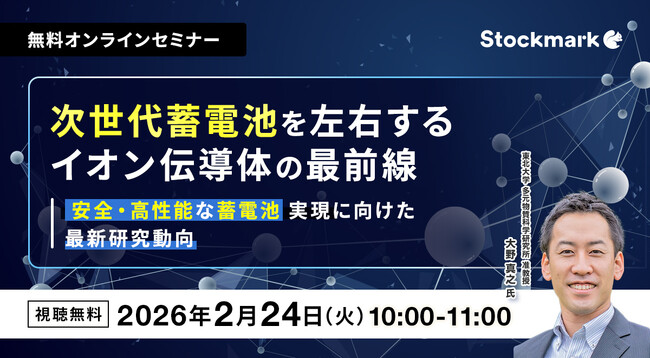 【2月24日(火) 無料セミナー】『次世代蓄電池を左右するイオン伝導体の最前線 ー 安全・高性能な蓄電池実現に向けた最新研究動向』(ストックマーク主催)