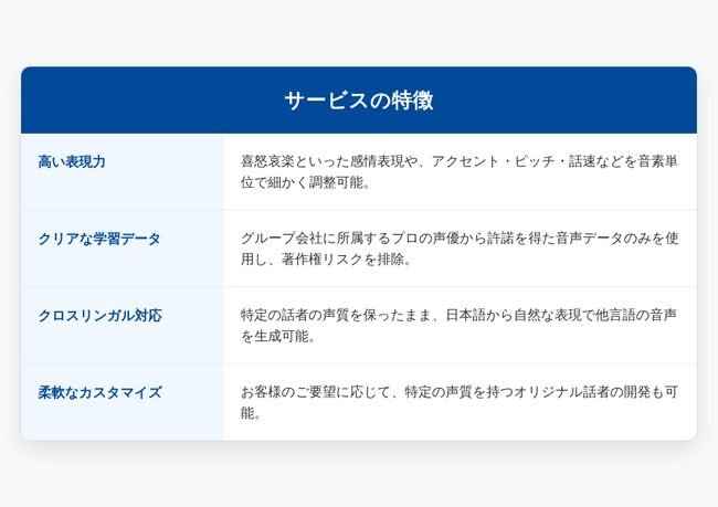 これにより、お客様は著作権侵害のリスクを心配することなく、安心して「NEXPEEECH(R)」が生成した音声を自社のサービスや製品に組み込むことができます。企業のコンプライアンスを遵守し、ブランドイメージを守る上で、学習データの透明性は何よりも重要であるとORENDA WORLDは考えます。