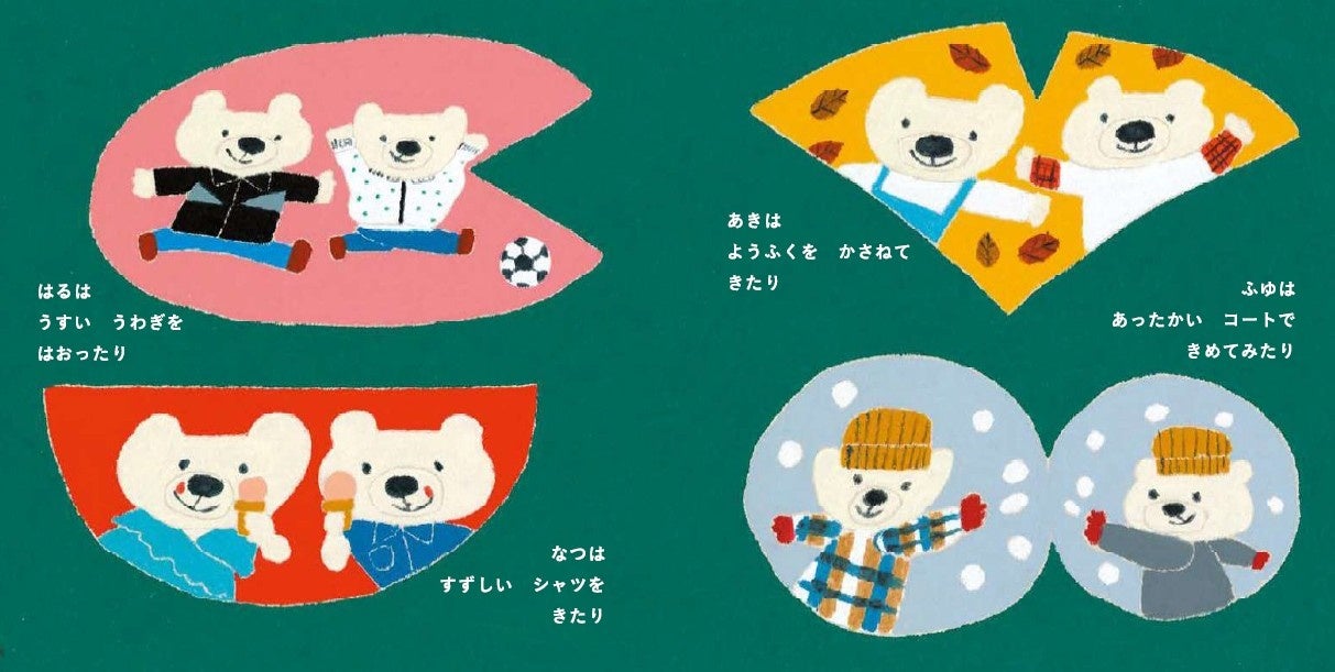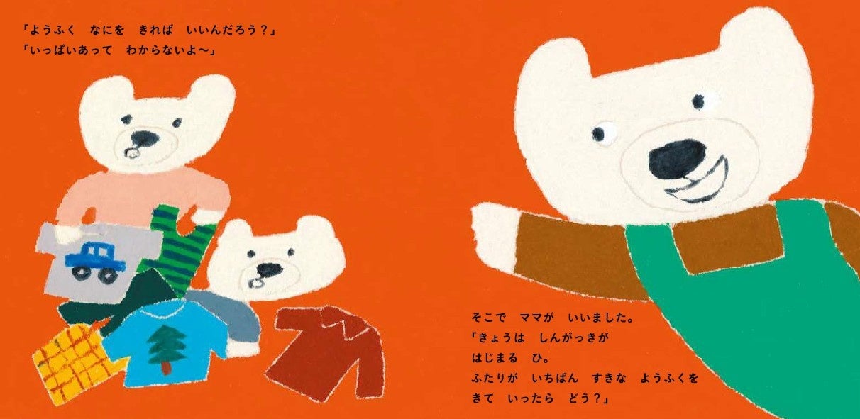 新学期、遠足、夏休みなど、子どもたちがドキドキ、ワクワク、モジモジ…する身近なシーンを舞台に、お気に入りの洋服がもたらす勇気やお揃いの服を着る喜びなど、洋服を通じて日常の特別な瞬間を見つけていく物語です。