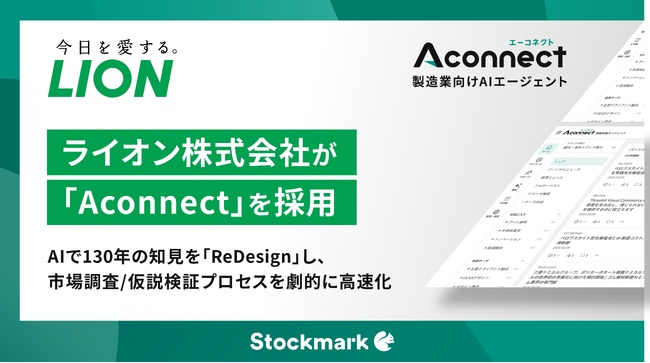 ストックマーク株式会社(本社:東京都港区、以下:当社)が提供する製造業向けAIエージェント「Aconnect」は、ライオン株式会社(本社:東京都台東区、以下:ライオン)に採用頂いたことをお知らせいたします。