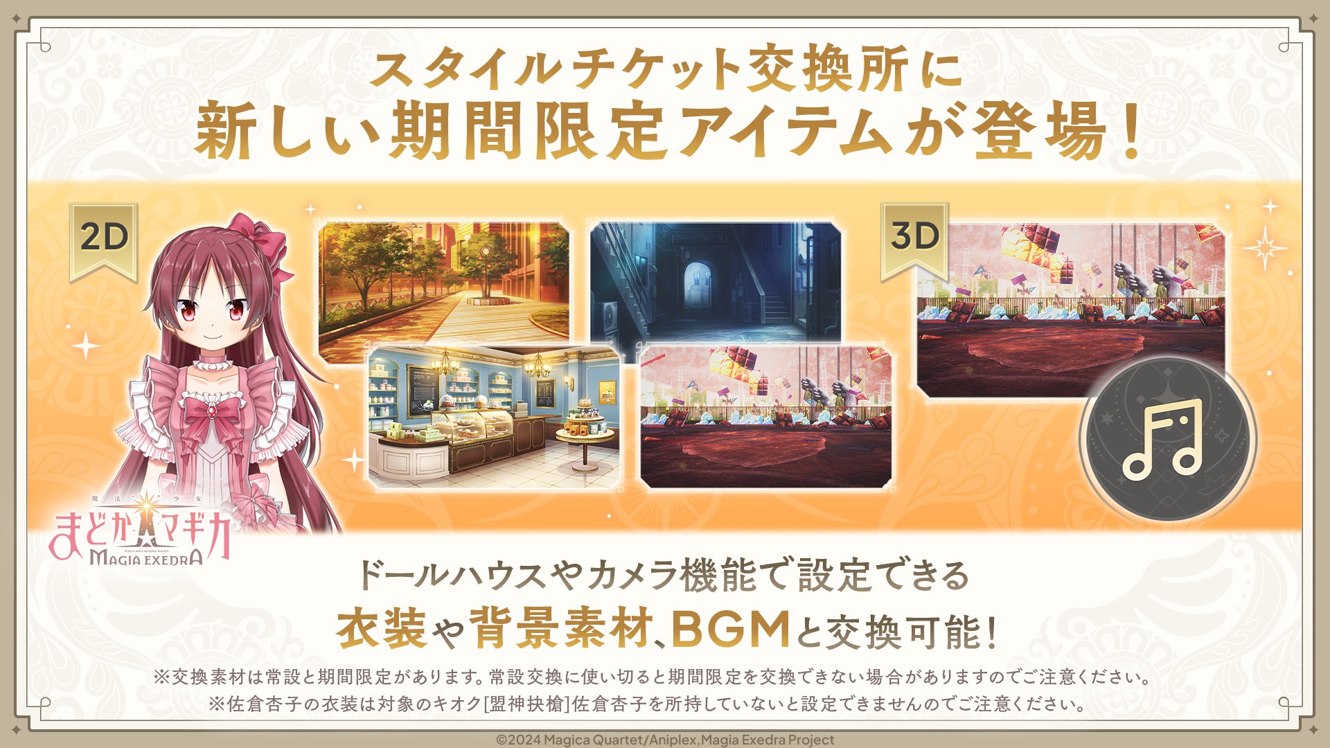 「スタイルチケット交換所」では、期間限定でパティシエールイベントに関連する2D背景や、新たに[盟神抉槍]佐倉杏子に紐づく、佐倉杏子のMagia Day 2025 2D衣装を交換いただくことができます。