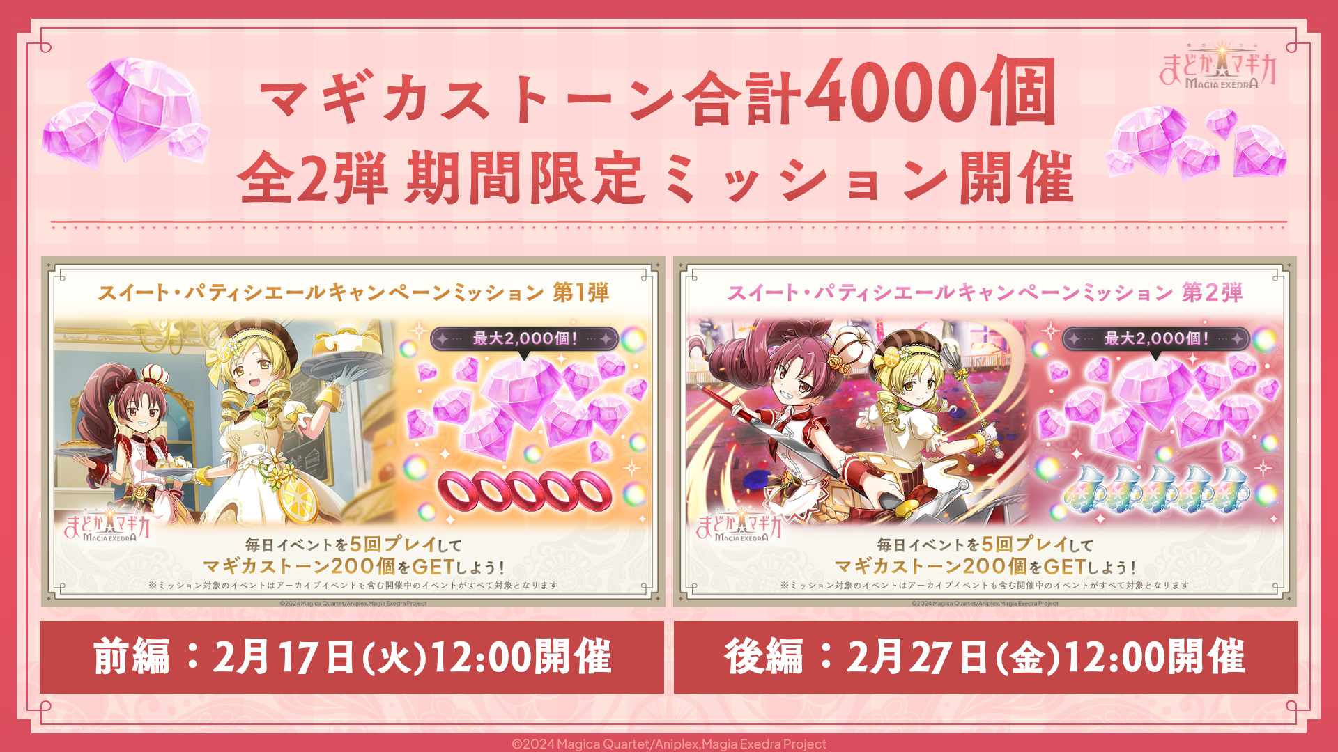 2026年2月17日(火)12時より、まどドラ 〜スイート・パティシエールキャンペーン〜 を開始いたしました。キャンペーン期間中、毎日ログインでマギカストーンが最大2,000個、期間中毎日イベントクエストをクリアで、マギカストーンが最大4,000個獲得でき、合計でマギカストーンを6,000個獲得いただけます。
