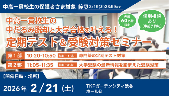 - 【累計参加者500名突破】中高一貫校生の「中だるみ脱却」と「大学合格」を叶える定期テスト&受験対策セミナー、2月14日(土)に新宿で開催決定!(吉祥寺、明大前、立川、津田沼、新浦安エリア)02/05 12:18