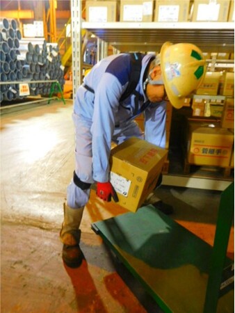 愛知管材工業は、JFE商事鋼管管材株式会社から、鋼管・管材の荷役作業を請け負っております。特に管材は1箱平均20kgと重く、入庫・出庫(出荷)での「棚への出し入れ作業」において、作業者は腰痛や指先のしびれが発生していました。また、高齢の作業者が比較的多い中、今後は女性の雇用も視野に入れていたため、将来の人材多様化も見据えて対策の検討を始めました。
