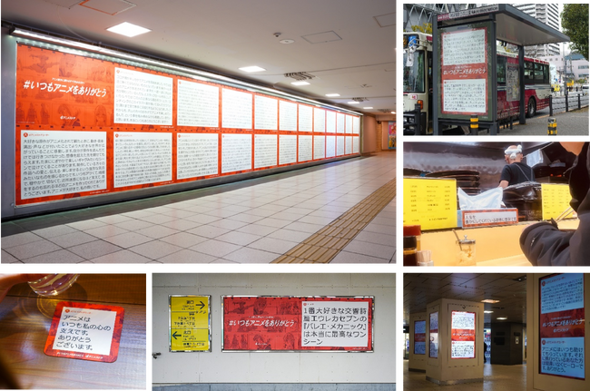 昨年11月「勤労感謝の日」から約2週間、特設サイトやXに寄せられた合計約900件のコメントの中から厳選。都内でアニメ制作にゆかりのある5エリア(池袋、荻窪、中野、武蔵堺、井荻)で、駅構内の大型広告をはじめ、バス停、電柱、喫茶店のコースター、ラーメン店のポケット箱まで幅広い形で掲出します。
