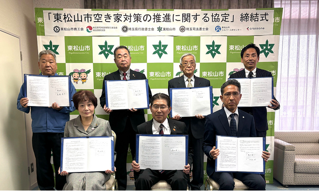 東松山市では、令和7年4月に「東松山市空家等対策計画」を改訂し、予防対策、適正管理、有効活用の3つの柱に沿って空家等対策に取り組んでいます。この度、株式会社クラッソーネ様を含む6団体と協定を締結いたしました。これにより、相続や遺言等の相談、売却や管理業者の紹介、そして解体シミュレーションや解体業者の紹介等、空き家に関するあらゆる相談に対応できるスキームが確立できます。今後も安全で快適なまちづくりならびに良好な住環境整備を推進してまいります。