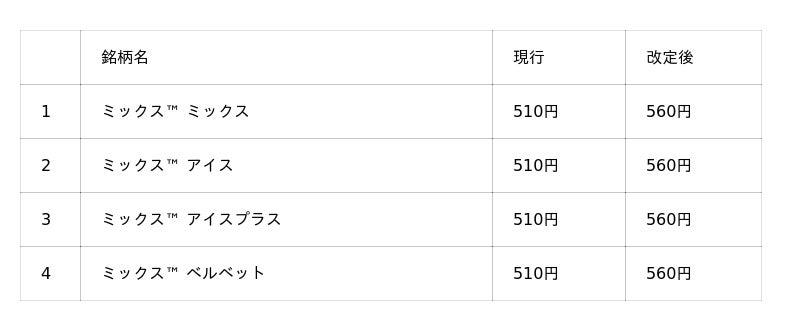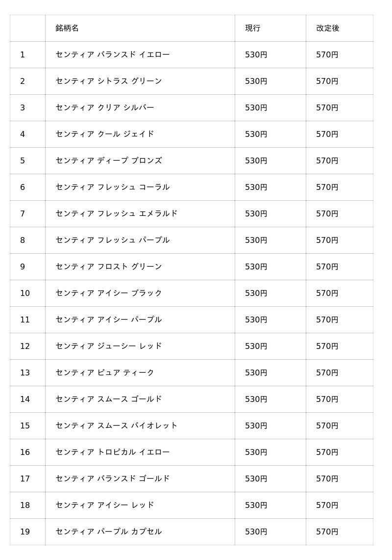 小売定価改定一覧(予定): 66銘柄
