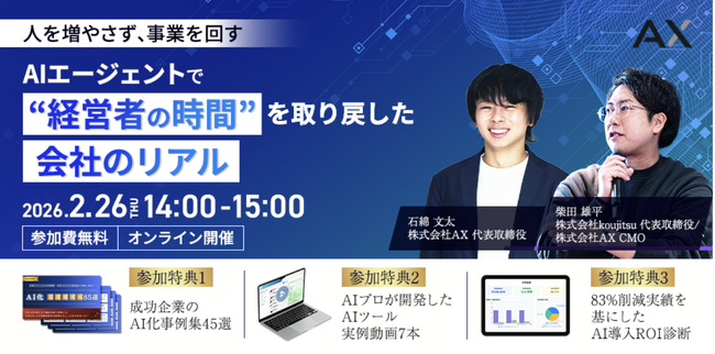 株式会社AX(所在地:福岡県福岡市、代表取締役:石綿 文太)は、株式会社koujitsuとの共催で、2026年2月26日(木)にオンラインセミナー「人を増やさず、事業を回す ー AIエージェントで"経営者の時間"を取り戻した会社のリアル」を開催することをお知らせいたします。