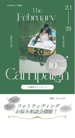 北海道札幌市のウエディングフォトスタジオ、aim札幌店の2月のキャンペーン情報をお届けいたします!フォトウェディングの際のお得情報やソロウェディングキャンペーンもご紹介をしております。