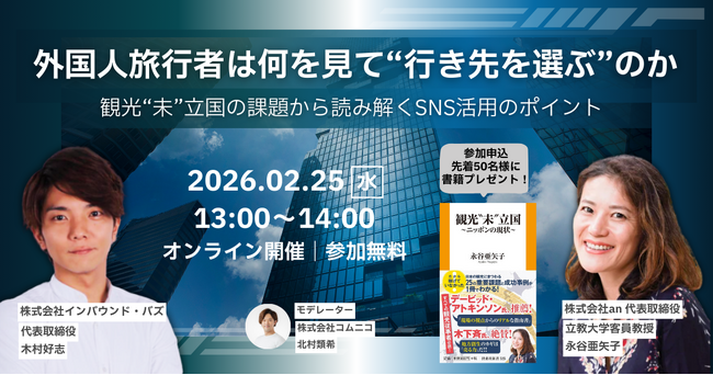 株式会社ラバブルマーケティンググループ(本社:東京都港区、代表取締役社長:林雅之、証券コード:9254)の子会社で、企業のSNSマーケティングを支援する株式会社コムニコ(本社:東京都港区、代表取締役:長谷川 直紀、以下 コムニコ)は、2月25日(水)13時から、株式会社anの代表取締役 永谷亜矢子氏と、コムニコの兄弟会社である株式会社インバウンド・バズの代表取締役 木村好志をゲストに迎え、無料オンラインセミナー「外国人旅行者は何を見て”行き先を選ぶ”のか」を開催いたします。