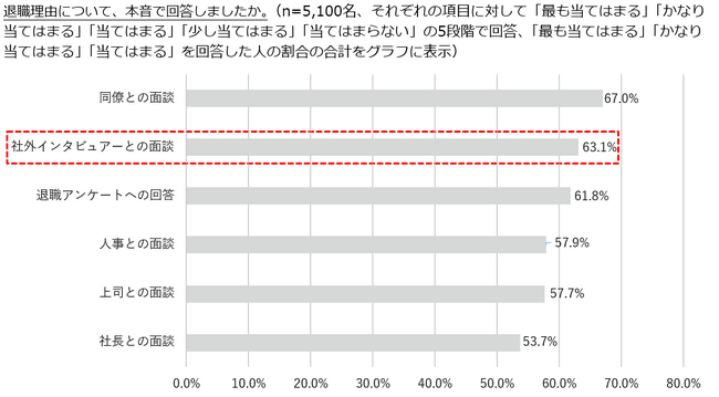 「上司との面談」が58.5%と最も多く、次いで「人事との面談」が30.5%と続きました。「社外インタビュアーとの面談」は7.1%と限定的な状況である一方、63.1%(「全て本音で話せた」18.2%と「やや本音で話せた」44.9%の合計)が退職理由を本音で話せたと回答しており、「人事との面談」(57.9%)や「上司との面談」(57.7%)を上回る結果となりました。同僚や利害関係のない第三者が聞き手となることで心理的ハードルが下がり、企業側として従業員の本音を引き出す有効な手段であることが裏付けられました。