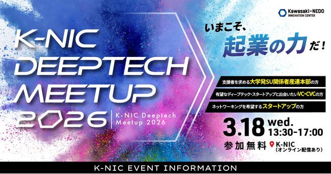 株式会社ツクリエ(本社:東京都千代田区 代表取締役:鈴木英樹 以下、ツクリエ)が川崎市から運営受託するKawasaki-NEDO Innovation Center(所在地:神奈川県川崎市 以下、K-NIC)は、2026年3月18日(水)に、ディープテック・スタートアップに特化したミートアップイベントを開催します。