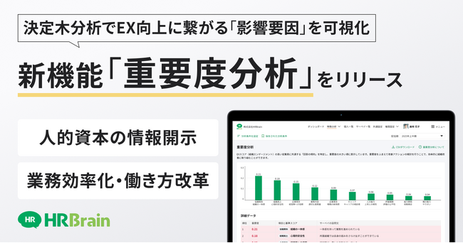 株式会社HRBrain(本社:東京都港区/代表取締役CEO:堀 浩輝、以下「当社」)は「HRBrain 組織診断サーベイ」において「重要度分析機能(以下、「本機能」)」を新たにリリースしました。本機能により、専門的な統計知識を必要とせず、誰でも直感的にEX(従業員体験)スコアに大きく影響する課題を導き出すことが可能になります。