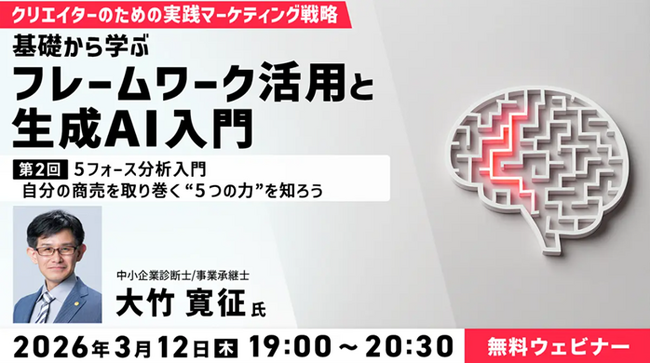 株式会社クリーク・アンド・リバー社(C&R社)は3月12日(木)、マーケティングや戦略思考に苦手意識のあるクリエイターや個人事業主の方を対象に無料のオンラインセミナー「クリエイターのための実践マーケティング戦略 ―基礎から学ぶフレームワーク活用と生成AI入門― 第2回:5フォース分析入門 自分の商売を取り巻く “5つの力” を知ろう」を開催します。