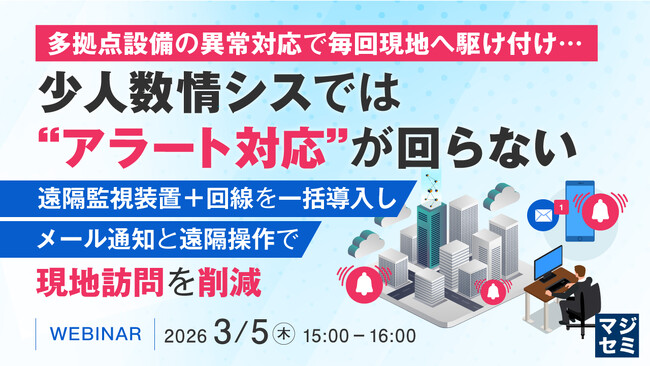 マジセミ株式会社は「多拠点設備の異常対応で毎回現地へ駆け付け…少人数情シスでは“アラート対応”が回らない」というテーマのウェビナーを開催します。