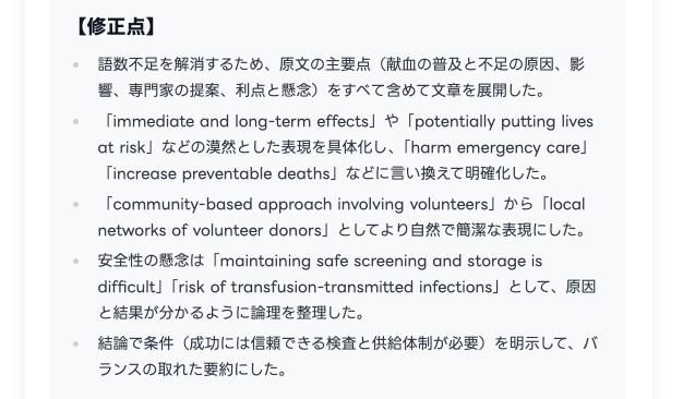 A. 本番で要件未達により大きく失点するリスクがある以上、練習段階で曖昧にせず、「語数を守ることを最優先で身につける」設計が必要だと判断しました。なお、語数逸脱で0点となった場合でも、次回改善につながるよう修正点・改善の方向性を提示します。