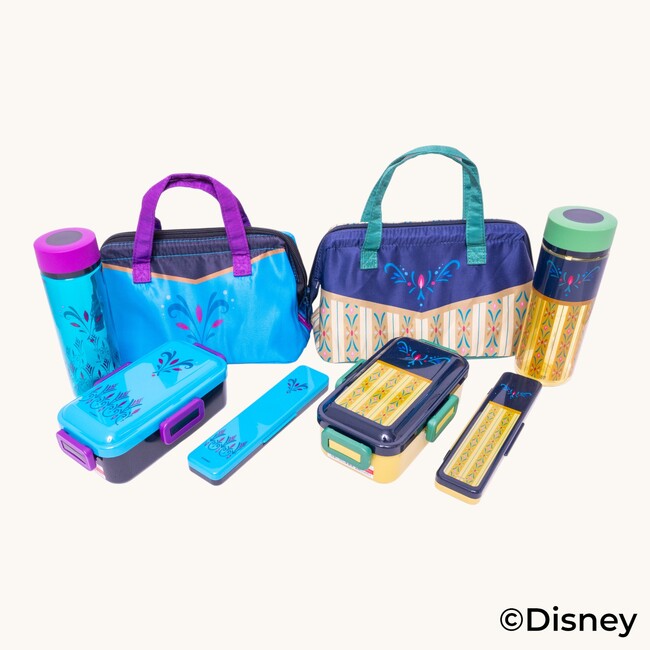 世代を超えて愛される『アナと雪の女王』の「アナ」と「エルサ」の美しいドレスの象徴的なモチーフとカラーリングをランチグッズのデザインへ落とし込み、日常使いしやすい落ち着いたトーンで表現しました。