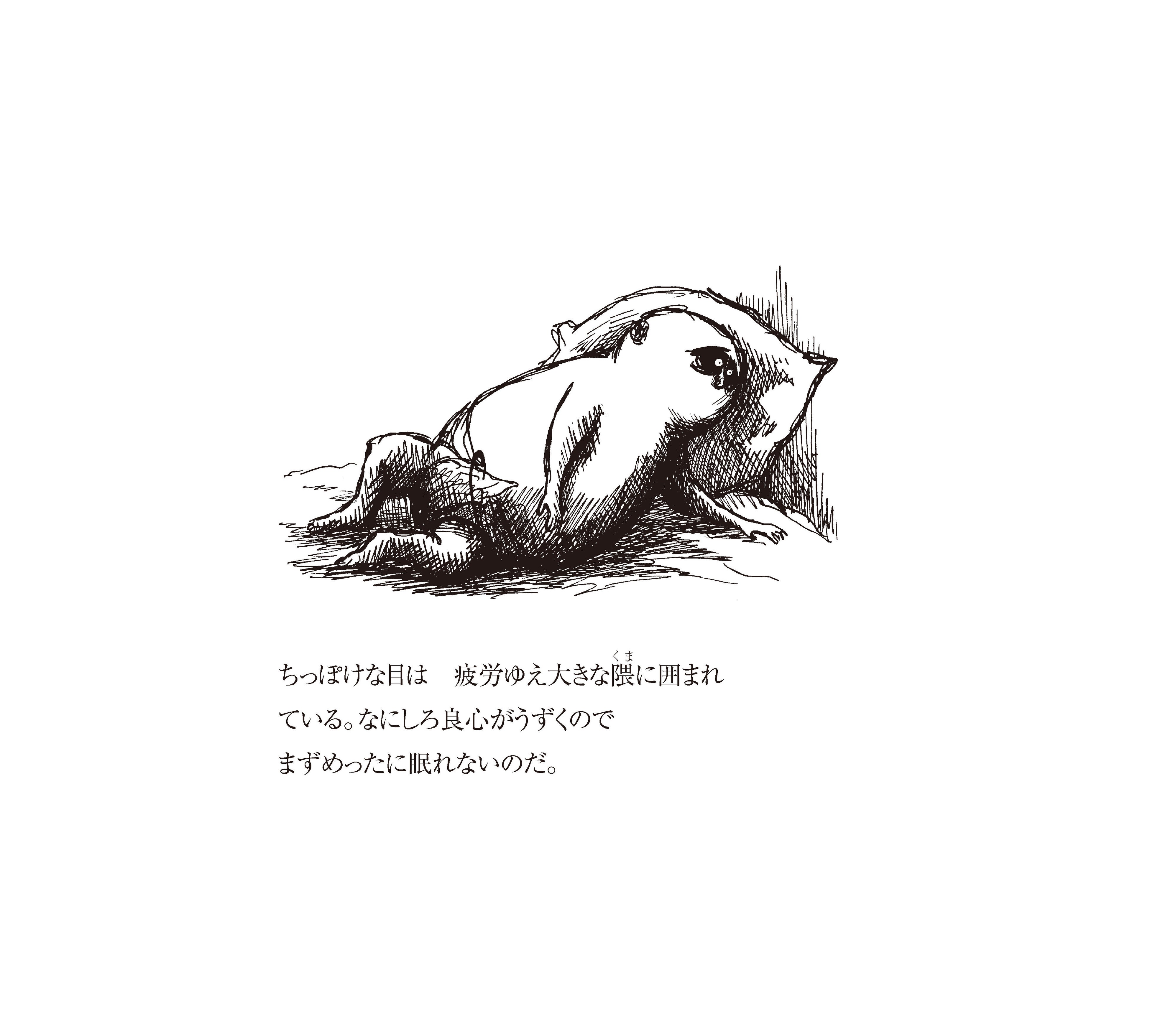 Its tiny eyes were surrounded by large black rings due to fatigue,for its guilty conscience hardly ever allowed it to sleep.