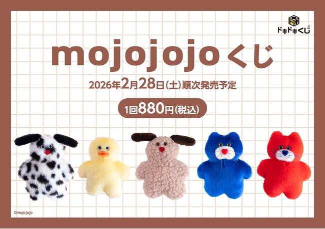 廣川株式会社(本社:大阪市天王寺区、代表取締役社長:廣川信也)が展開するくじブランド「ドキドキくじ」では、2026年2月28日(土)よりぬいぐるみ・雑貨ブランドの「mojojojo(モジョジョジョ)」とタイアップした「mojojojoくじ」を、全国の書店、各種ホビーショップ、バラエティショップで順次発売いたします。