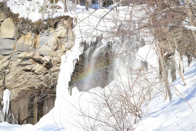 滝野すずらん丘陵公園(札幌市南区滝野247)では、“日本の滝百選”アシリベツの滝にこの時期限定の氷瀑&虹が出現しています。