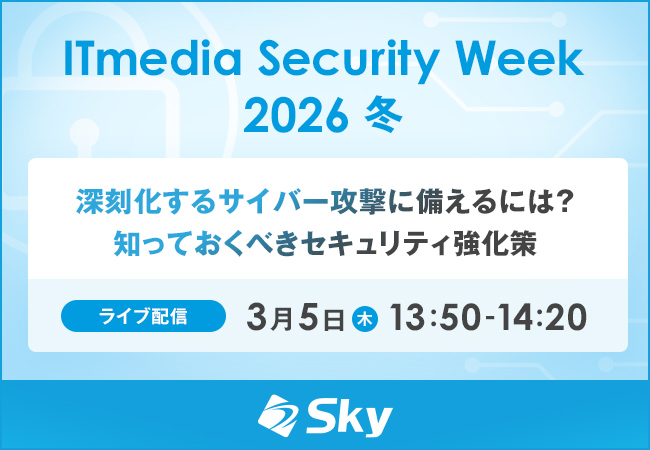 Sky株式会社は、2026年3月2日(月)~3月9日(月)に開催されるライブ配信セミナー「ITmedia Security Week 2026 冬~AI時代に価値の源泉であるデータを守るには~」に協賛いたします。