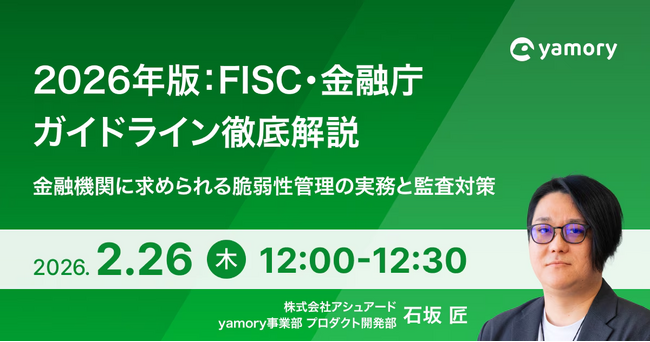 株式会社アシュアード(本社:東京都渋谷区、代表取締役社長:大森 厚志)が運営する、脆弱性管理クラウド「yamory(ヤモリー)」(https://yamory.io/ 以下「yamory」)は、2026年2月26日(木)に「2026年版:FISC・金融庁ガイドライン徹底解説ウェビナー」を開催することをお知らせいたします。